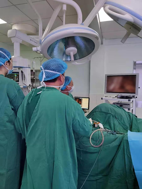 經(jīng)過近3個(gè)半小時(shí)的奮戰(zhàn),周旭陽主任率領(lǐng)的醫(yī)師團(tuán)隊(duì)與麻醉團(tuán)隊(duì)、手術(shù)室團(tuán)隊(duì)的精妙配合下,在腹腔鏡下將腸癌處病灶順利切除,標(biāo)本經(jīng)腹部小口子取出。同時(shí),相應(yīng)區(qū)域的血管離斷,神經(jīng)保護(hù),淋巴清掃都如期進(jìn)行,手術(shù)結(jié)束后,邱奶奶腹部僅開了個(gè)小口子。