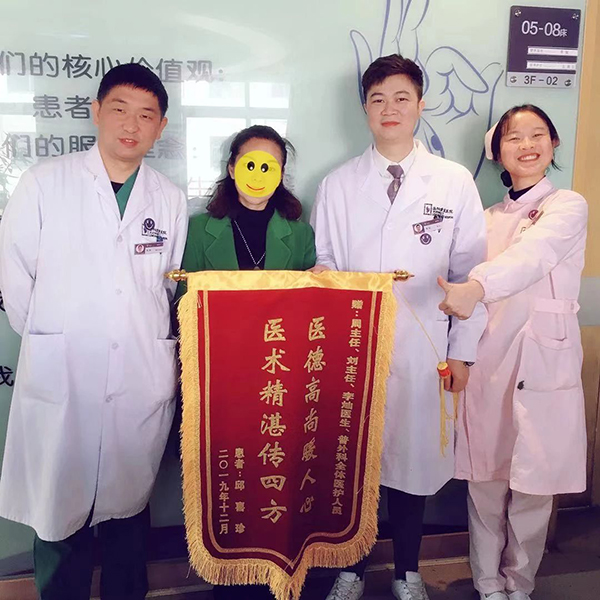 術(shù)后常規(guī)予以預(yù)防感染、營養(yǎng)支持等相關(guān)治療,邱奶奶恢復(fù)良好,二天下床活動(dòng)并進(jìn)流質(zhì)飲食,八天拔引流管,十天拆線,按原計(jì)劃出院。如此小的創(chuàng)口和如此快的恢復(fù)速度,這一神奇的手術(shù)令邱奶奶一家人都驚喜不已,連連稱贊并送來錦旗表示感謝。