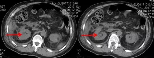 術(shù)后CT,箭頭所指為腎結(jié)石被徹底清除
