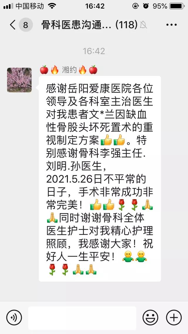 “手術(shù)非常成功非常完美!感謝骨科全體醫(yī)生、護士,你們就像我的家人一樣待我好,我來愛康真是來對地方了!不但實現(xiàn)了我甩掉雙拐的愿望,讓我終于可以“挺直腰桿”了!還讓我感受到與其他醫(yī)院的不同,原來在醫(yī)院也可以享受親人般的關(guān)懷,很溫暖.......”文娭毑發(fā)自內(nèi)心的說道,手術(shù)完成的當晚文娭毑便在骨科醫(yī)患溝通群內(nèi)發(fā)出感謝的話語。