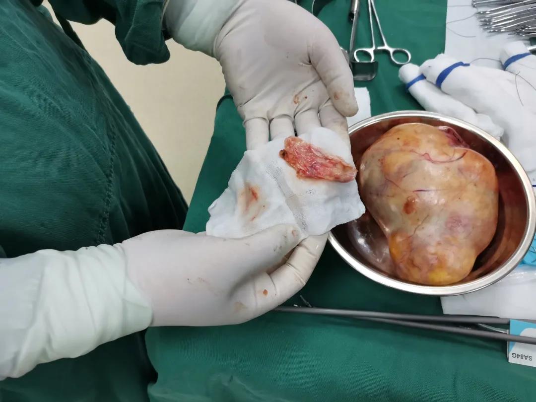 有了周詳?shù)挠媱?,經過充分的術前準備,手術順利開展了,考慮腹腔腫塊較大,醫(yī)生選擇在下腹部開一小切口,取出腫塊。經過醫(yī)生與麻醉師一個多小時的努力奮戰(zhàn),終于成功摘除了楊娭毑的定時“炸彈”,手術順利完成,觀察楊娭毑生命體征平穩(wěn)后,手術室緊張的氣氛頓時緩解了,醫(yī)生與麻醉師同時露出滿意的笑容。