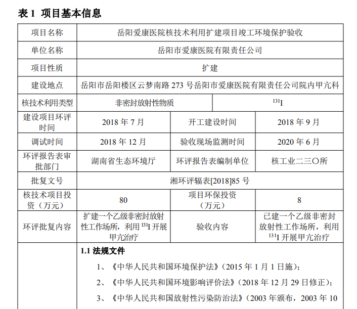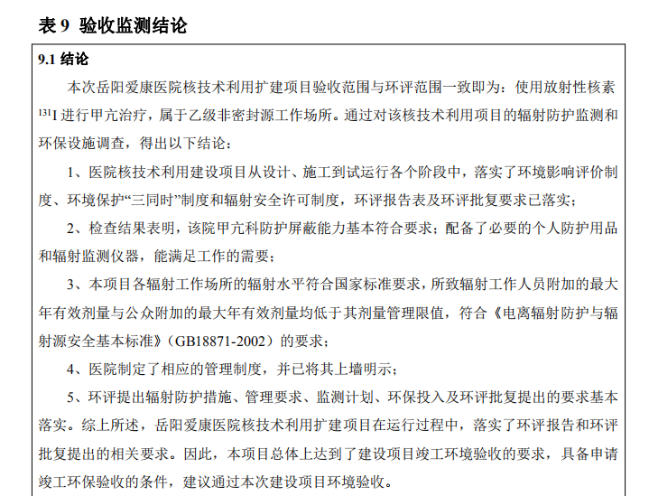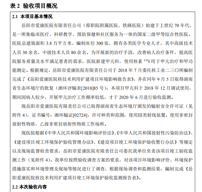 2020 年 11 ? 11 ?,岳陽市愛康醫(yī)院有限責(zé)任公司根據(jù)《建設(shè)項?竣?環(huán)境保護驗收暫?辦法》、環(huán)境影響評價報告表及批復(fù)?件等要求,組織有關(guān)專家和單位召開驗收會議(驗收組名單?簽到表),對核技術(shù)利?擴建項?(已建?個?級?密封放射性?作場所,利? 131I 開展甲亢治療)進?竣?環(huán)境保護驗收,驗收組部分成員進?了現(xiàn)場踏勘、查閱了資料,形成如下意見: