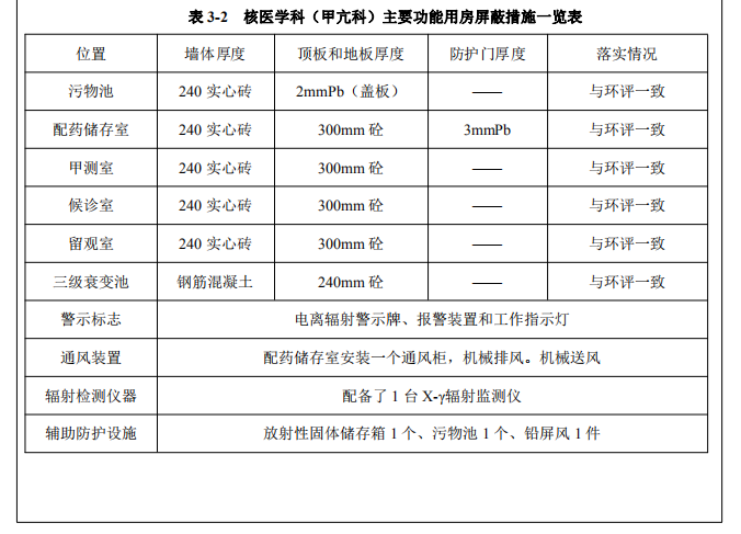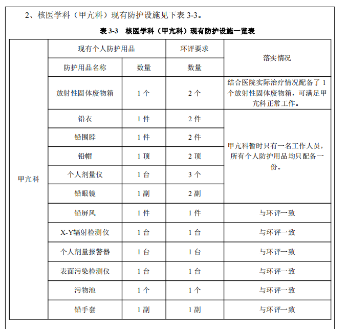 甲亢科?房位于急診樓相連建筑?北??層,本項??作場所按照環(huán)評要求進?改建。觀察窗為 3mm 鉛當(dāng)量,防護?為 3mm 鉛當(dāng)量;建有通?裝置和廢?三級衰變池并設(shè)置電離輻射警示標(biāo)識。輻射?作?員配備了個?劑量計、鉛?、鉛帽和鉛眼鏡等防護?品。