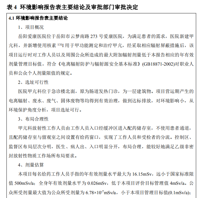建設(shè)地點:岳陽市岳陽樓區(qū)云夢南路 273 號岳陽市愛康醫(yī)院有限責(zé)任公司院內(nèi)甲亢科