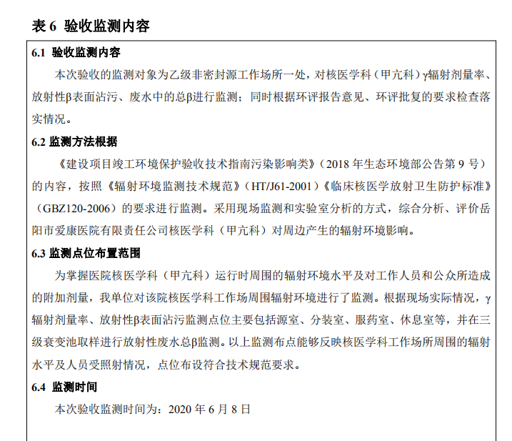 根據(jù)湖南凱星環(huán)保科技有限公司對岳陽愛康醫(yī)院核技術(shù)利?擴建項?現(xiàn)場驗收監(jiān)測報告數(shù)據(jù)顯示:各監(jiān)測點位γ輻射劑量率、放射性β表?沾污、廢?總β,均滿?環(huán)評報告表中的有關(guān)要求。