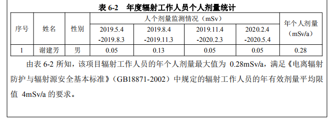 根據(jù)湖南省職業(yè)病防治院出具的 2019 年-2020 年年度的岳陽市愛康醫(yī)院有限責(zé)任公司個?劑量監(jiān)測報告顯示:輻射?作?員的個?劑量均滿?環(huán)評報告中的有關(guān)要求。